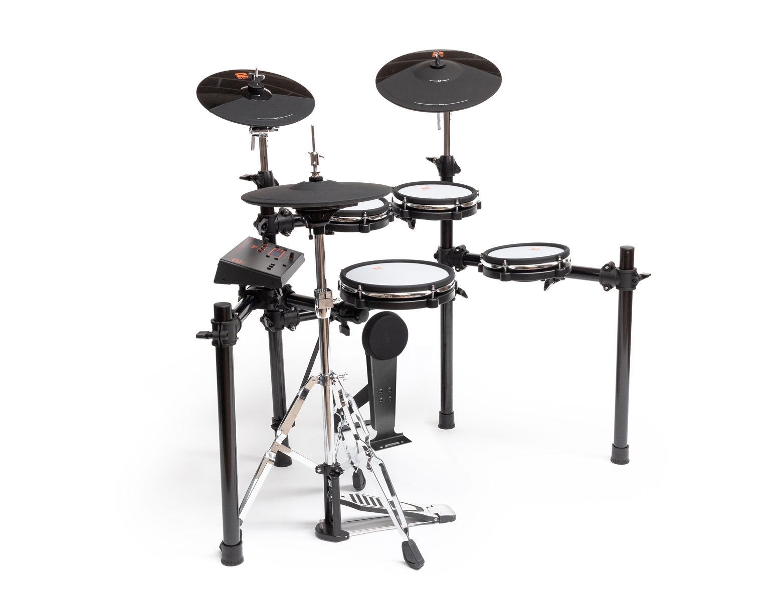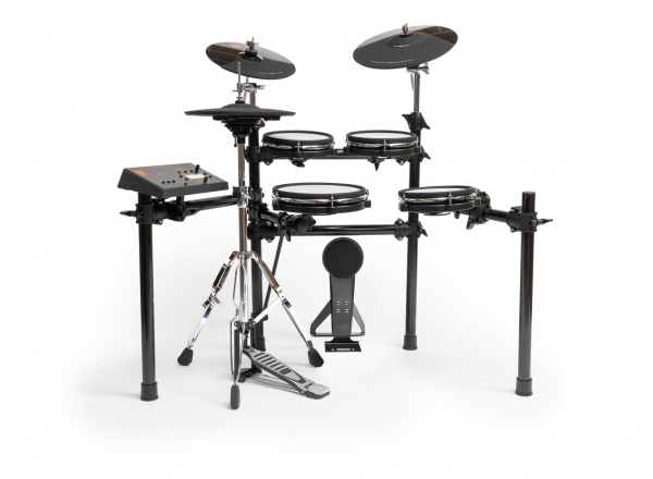 Professionelles, fünfteiliges Set mit 6 Kick, 10 Snare, drei 8 Toms, 12 Crash, 14 Ride und 13 Hihat. Toms und Snare sind 2-Zonen-Pads und mit Mesh Heads bestückt, das 2-Zonen-Crash und das 3-Zonen-Ride haben beide eine Choke-Funktion. Das kompakte und leicht zu montierende Rack benötigt eine Aufbaufläche von lediglich 1,20 x 0,70 m. Im Lieferumfang sind alle nötigen Halterungen und Anschlusskabel.