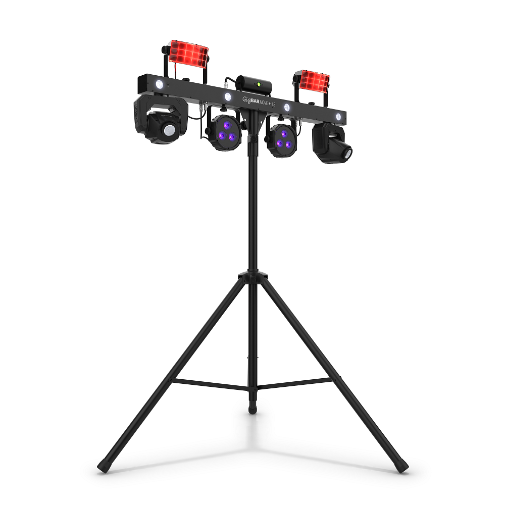 - 5-in-1 lighting system that includes moving heads, derbies, washes, a laser and strobe effect pre-mounted on a single bar